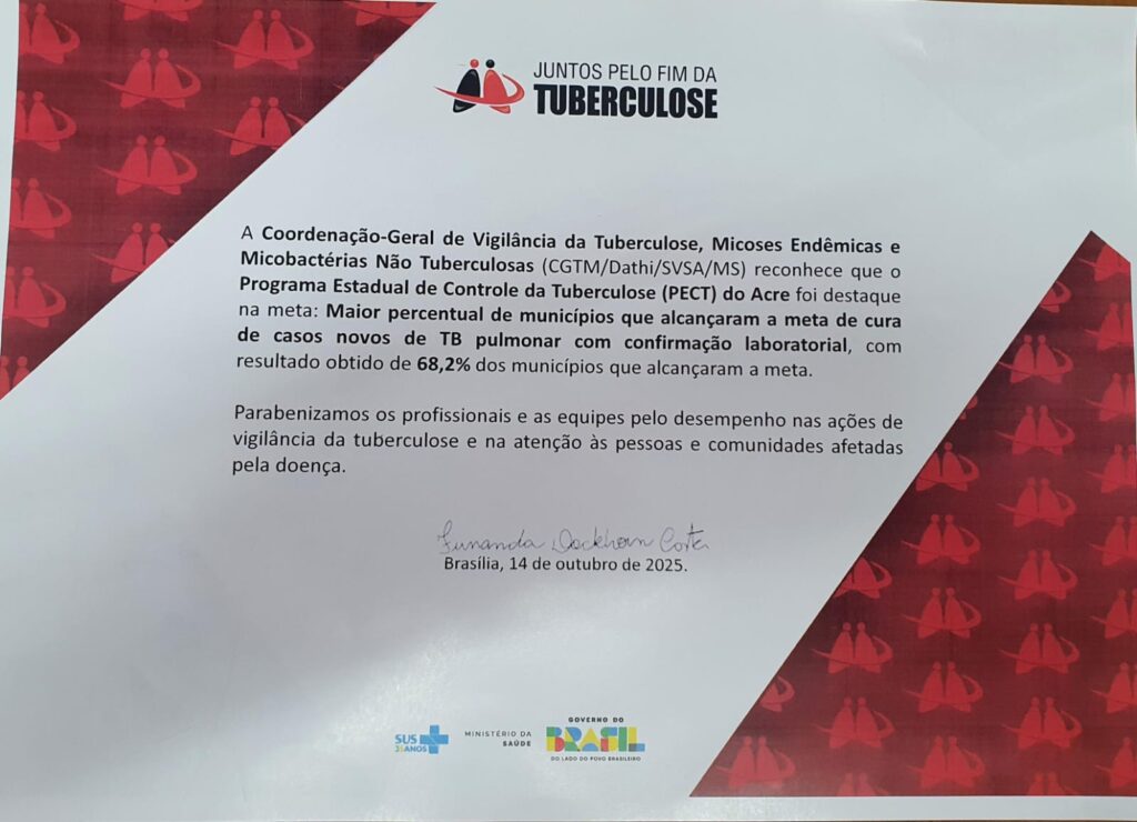 O Acre recebeu do Ministério da Saúde um importante reconhecimento pelo desempenho no controle da tuberculose. A homenagem foi concedida à Secretaria de Estado de Saúde (Sesacre), por meio da Coordenação-Geral de Vigilância da Tuberculose, Micoses Endêmicas e Micobactérias Não Tuberculosas (CGTM/Dathi/SVSA/MS), que destacou o Programa Estadual de Controle da Tuberculose (PECT) como referência entre os estados brasileiros.