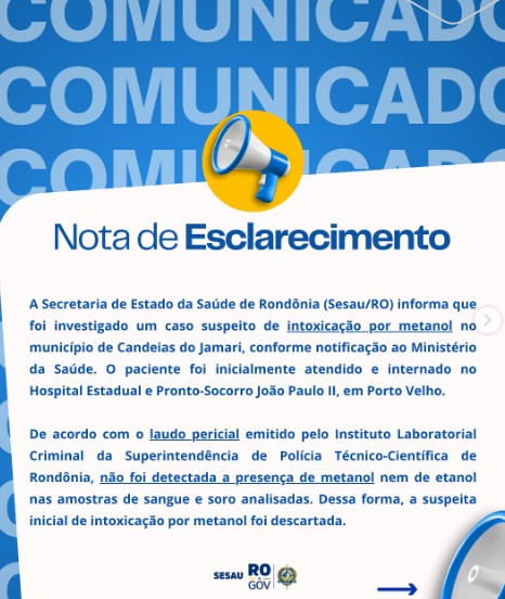 A Secretaria Estadual de Saúde de Rondônia publicou uma nota de esclarecimento (veja abaixo). na noite deste domingo, 5, afirmando que descartou o caso suspeito de intoxicação por metanol no município de Candeias do Jamari. O Ministério da Saúde havia divulgado no sábado, 4, a suspeição do caso no município localizado a 20 km de Porto Velho, capital rondoniense.