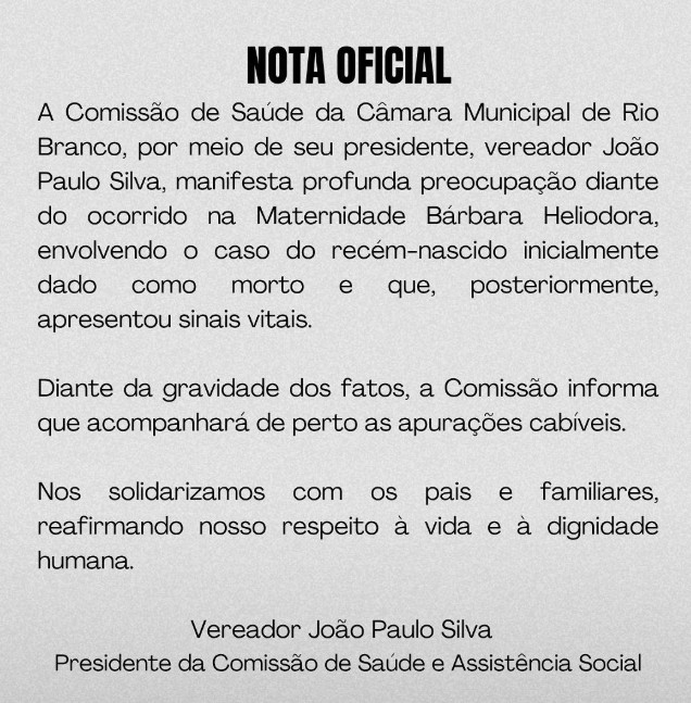 A Comissão de Saúde da Câmara Municipal de Rio Branco, por meio do presidente, vereador João Paulo Silva, se posicionou e manifestou profunda preocupação diante do ocorrido na maternidade Bárbara Heliodora. Diz ainda na nota que, diante da gravidade dos fatos, a comissão acompanhará de perto as apurações cabíveis.