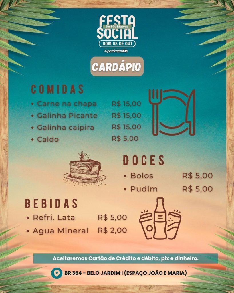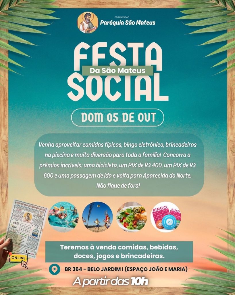 No próximo domingo, 5 de outubro, a Paróquia São Mateus promove sua tradicional Festa Social, a partir das 10h, na Chácara João e Maria, localizada na BR-364, no bairro Belo Jardim I. O evento promete reunir famílias em um dia de fé, confraternização e diversão.