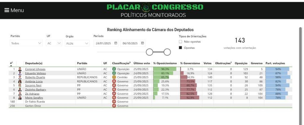 Segundo levantamento, desde o início da atual legislatura, Coronel Ulysses deixou de acompanhar o governo em 84,9% das votações submetidas ao Plenário da Câmara dos Deputados. Em um recorte mais recente, considerando apenas este ano, o índice chega a 96,3%, consolidando-o como o maior opositor ao Governo Federal entre os deputados acreanos.