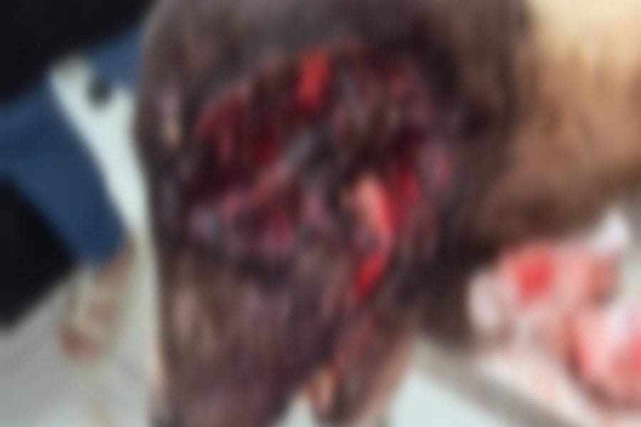 De acordo com a parlamentar, o animal foi encontrado com parte do focinho e cabeça expostos por uma ferida profunda, expondo parte do osso do crânio.