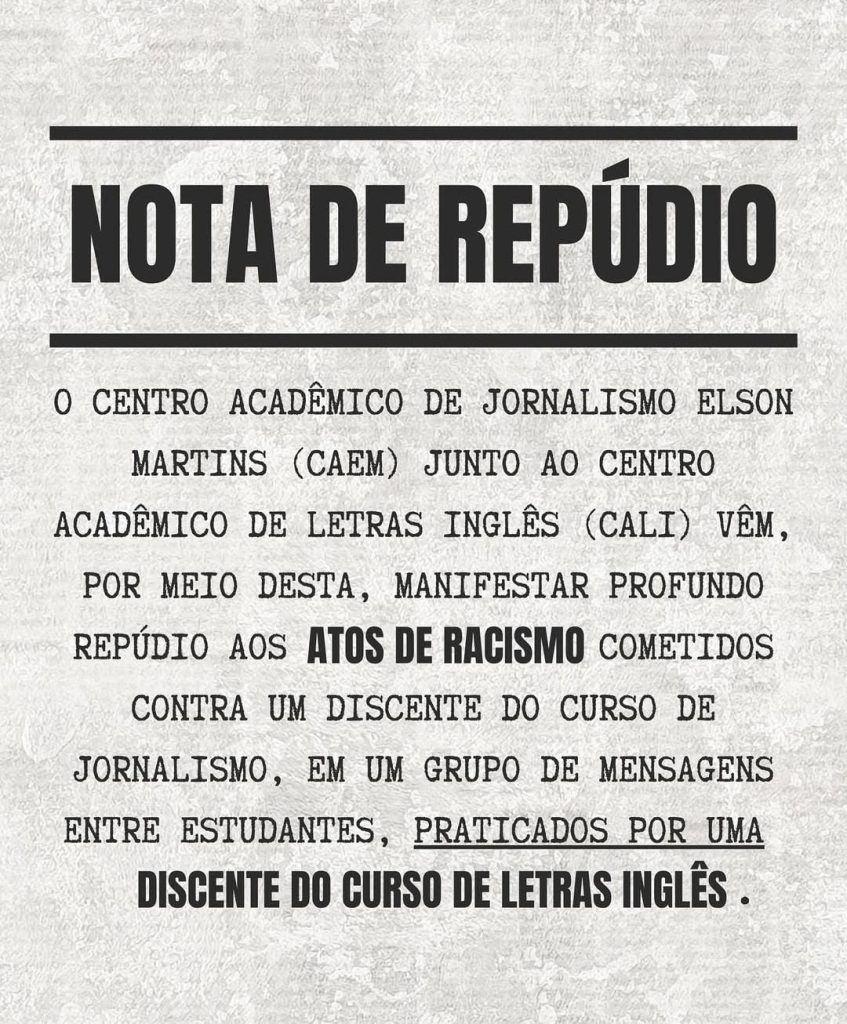 “O racismo é um crime e uma ferida histórica que segue sendo reaberta todas as vezes que uma pessoa negra é desrespeitada, violentada ou ridicularizada pela cor de sua pele. Os centros de Jornalismo e de Inglês reafirmam que não serão coniventes com atitudes racistas, tampouco com qualquer tentativa de silenciamento das vítimas”, diz trecho da nota.
