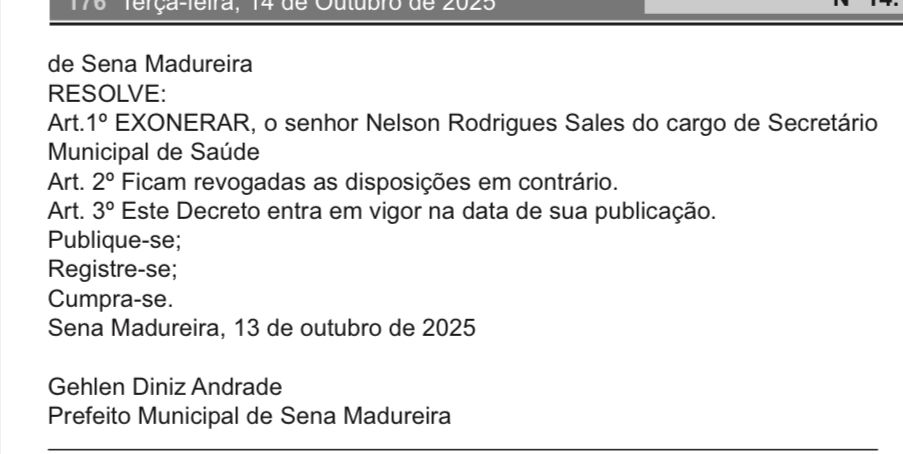 Mais um secretário do primeiro escalão da prefeitura de Sena Madureira foi exonerado pelo prefeito Gerlen Diniz (Progressistas). A exoneração de Nelson Sales, que estava a frente da Secretaria Municipal de Saúde, foi oficializada na edição desta terça-feira, 14, do Diário Oficial do Estado.