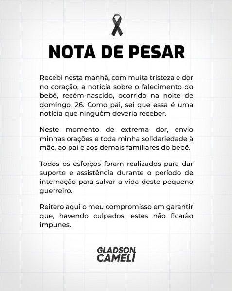 Em nota publicada nas redes sociais, o governador expressou solidariedade à família e destacou que todos os esforços foram realizados para salvar a vida do bebê. Ele também afirmou que o governo estadual acompanhará as investigações e garantiu que, se houver responsáveis, eles não ficarão impunes.
