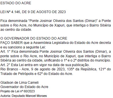 As informações são de que a escolha pelo nome do homenageado foi do governador Gladson Camelí. Ocorre que uma lei, sancionada pelo próprio Gladson, denomina a obra como “Ponte Josimar Oliveira dos Santos (Dimar). O Projeto de Lei, de autoria do deputado Manoel Moraes (PP), foi sancionado pelo governador e publicado no Diário Oficial do dia 14 de agosto de 2023 (veja abaixo).