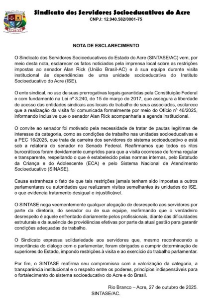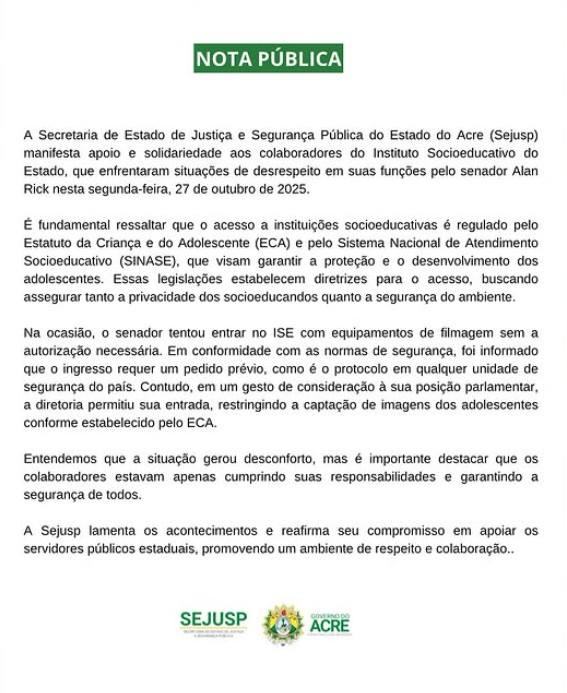 Por sua vez, Alan Rick foi defendido pelo Sindicato dos Servidores Socioeducativos do Acre (Sintase) que afirma que a direção do ISE foi informada da visita por meio de ofício, declara ainda que todos os trâmites burocráticos para que a agenda fosse realizada foram cumpridos e volta a afirmar que as mesmas restrições em relação ao uso de equipamentos como câmeras e celulares não foram adotadas durante visitas de outros parlamentares e autoridades. Veja abaixo.