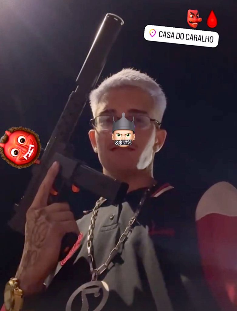Nas redes sociais, o jovem aparecia em fotos ao lado de colegas, exibindo símbolos associados a facções criminosas e posando com uma arma semelhante a uma metralhadora.
