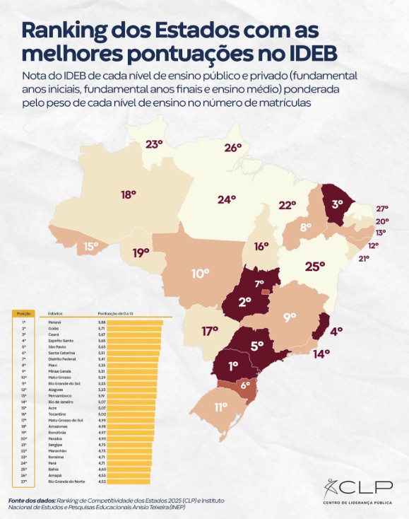 Um ranking divulgado pelo Centro de Liderança Política (CLP) coloca o Acre como o estado com a melhor nota do IDEB (Índice de Desenvolvimento da Educação Básica) de cada nível de ensino público e privado, seja fundamental anos iniciais, fundamental anos finais e ensino médio na Região Norte.