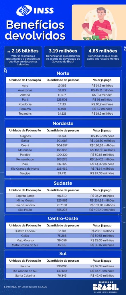 Nesta semana, foram pagos R$ 2,1 bilhões no acordo de ressarcimento a 3,1 milhões de aposentados e pensionistas. O pagamento é feito diretamente na conta do benefício, com correção pela inflação (IPCA), sem necessidade de ação judicial.