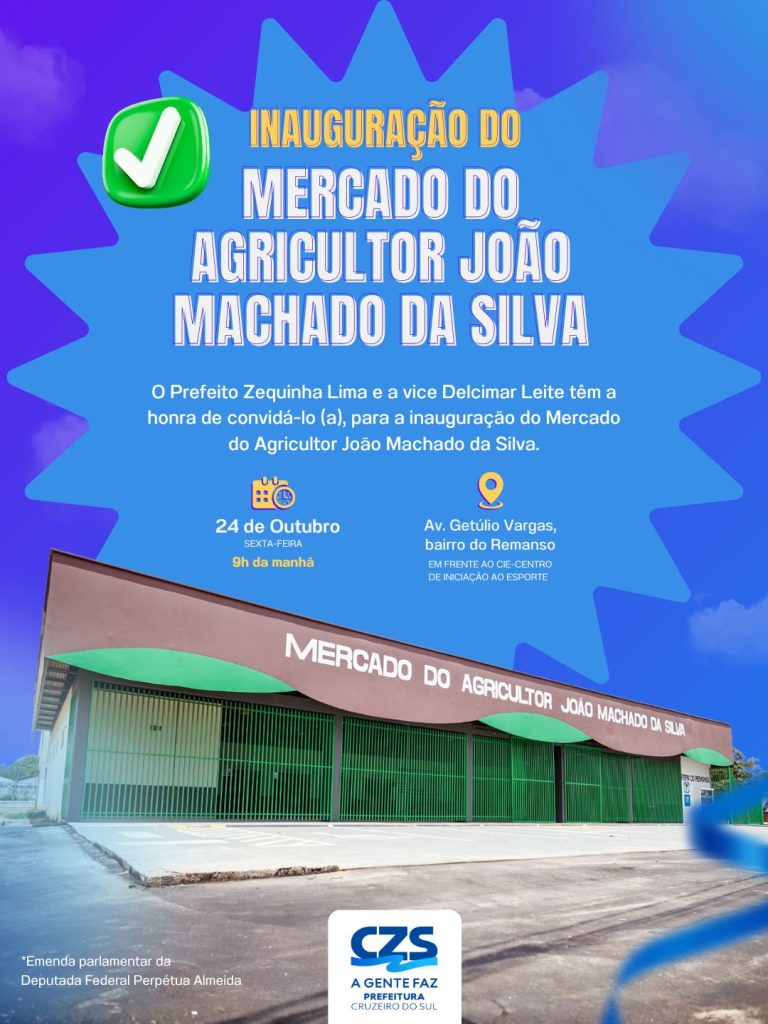 O Prefeito de Cruzeiro do Sul, Zequinha Lima,vai inaugurar na sexta-feira, 24, as 9h o Mercado do Agricultor João Machado da Silva, no Bairro do Remanso. O mercado foi construído com recursos de uma emenda parlamentar da ex-deputada federal Perpétua Almeida no valor de R$ 1,2 milhão, com contrapartida da gestão municipal, de R$ 90 mil.