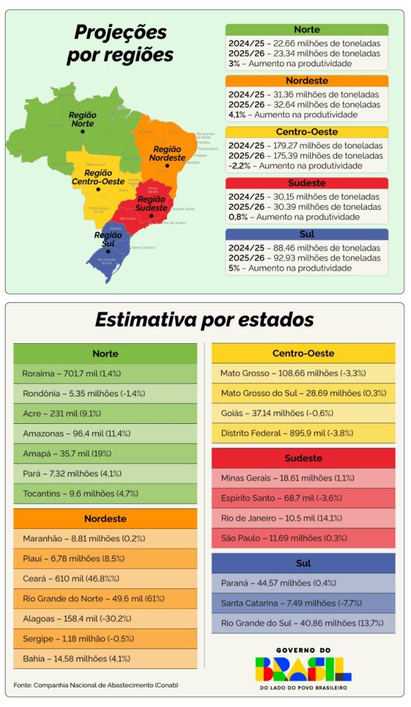 NACIONAL – O primeiro levantamento da safra de grãos 2025/26 da Conab indica novo ciclo de crescimento para a agricultura nacional. A produção total está estimada em 354,7 milhões de toneladas de grãos, aumento de 0,8% em relação ao volume colhido no ciclo anterior, que foi o maior da série histórica, com 350,2 milhões de toneladas. A área a ser semeada também deve crescer 3,3%, e chegar a 84,4 milhões de hectares.