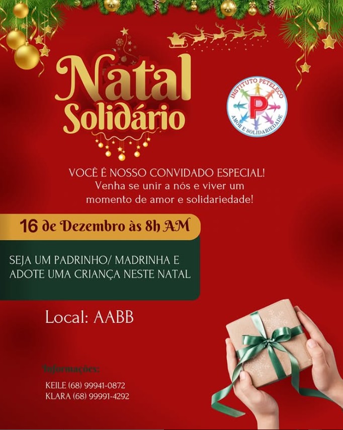 O Instituto Peteleco se prepara para realizar mais uma edição do seu evento mais afetivo e esperado do ano: o Natal Solidário, que chega agora à sua 10ª edição, reunindo padrinhos, madrinhas, crianças e a comunidade em um grande momento de confraternização e solidariedade. A ação acontece no dia 16 de dezembro, a partir das 8h, na AABB, em um evento aberto ao público.