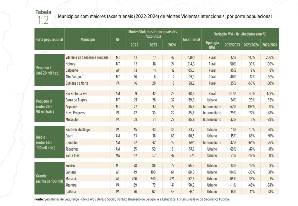A seção da pesquisa considera os municípios que registraram as maiores taxas trienais de mortes violentas intencionais entre 2022 e 2024, organizados em quatro grupos, conforme o porte populacional. Foram destaques cidades do Mato Grosso, Pará, Amazônia, Amapá e Maranhão.