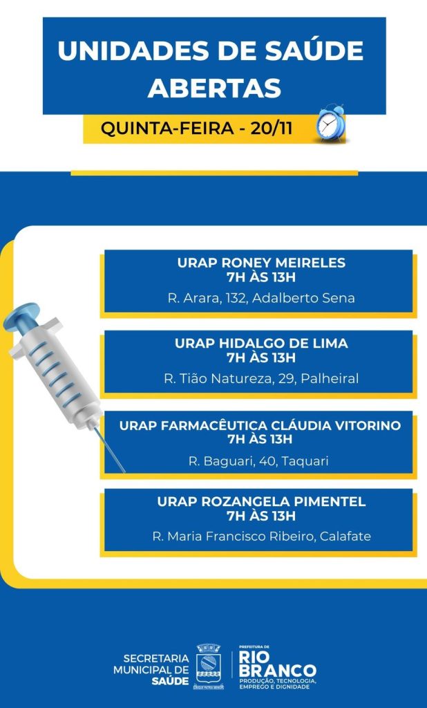 Mesmo sendo feriado nesta quinta-feira, 20 de novembro, em celebração ao Dia da Consciência Negra, a Prefeitura de Rio Branco informou que algumas unidades de saúde estão funcionando normalmente, das 7h às 13h. A medida visa garantir atendimento à população que necessita de serviços básicos de saúde. A iniciativa busca ajudar quem não tem disponibilidade de ir até uma unidade durante os dias de trabalho e pode aproveitar o feriado para cuidar da saúde.