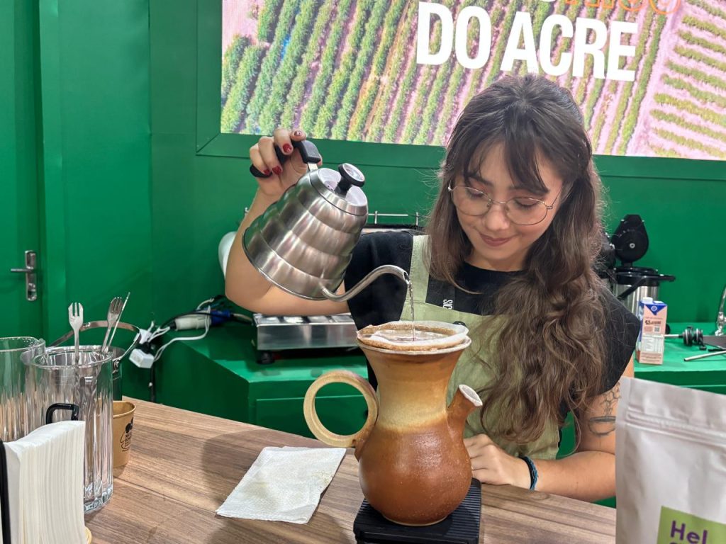 No Brasil desde 2016, a barista venezuela Giovana Serrano é um dos destaques do estande do café Robustas Amazônicos do Acre na Semana Internacional do Café (SIC) 2025. A profissional compartilhou que o primeiro contato com o café começou ainda no ambiente familiar, com o avô sendo produtor, mas que nunca pensou em investir no setor até chegar no país.