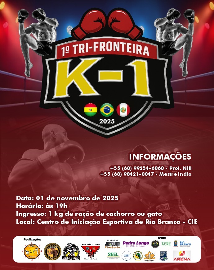O evento, intitulado “1º Tri-Fronteira K-1”, será realizado no próximo dia 1º, às 19h, no Centro de Iniciação Esportiva de Rio Branco (CIE), no bairro Aeroporto Velho, em Rio Branco. O ingresso para a entrada é a doação de 1 kg de ração para cachorro ou gato.