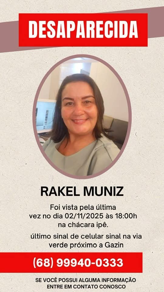 A família de Rakel Muniz busca informações sobre o paradeiro da mulher, desaparecida desde a tarde de domingo, 2, em Rio Branco. Ela foi vista pela última vez por volta das 18h, na chácara Ipê, e desde então não fez mais contato.