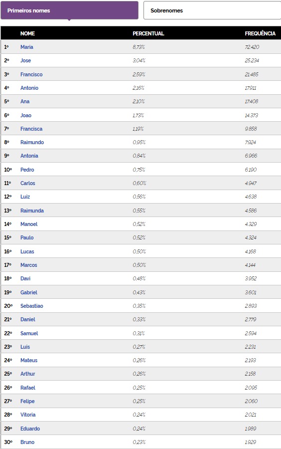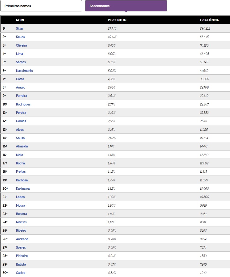 Veja abaixo o top 30 do ranking dos nomes e sobrenomes mais populares.