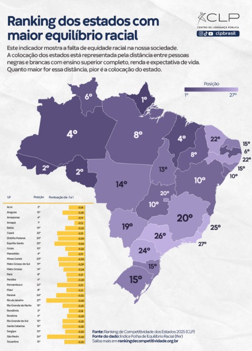 Um estudo divulgado pelo Centro de Liderança Pública (CLP) nesta quinta-feira,  20, data em que é celebrado o Dia da Consciência Negra,  mostra que o Acre é o segundo estado do país com a maior média de equilíbrio racial.
