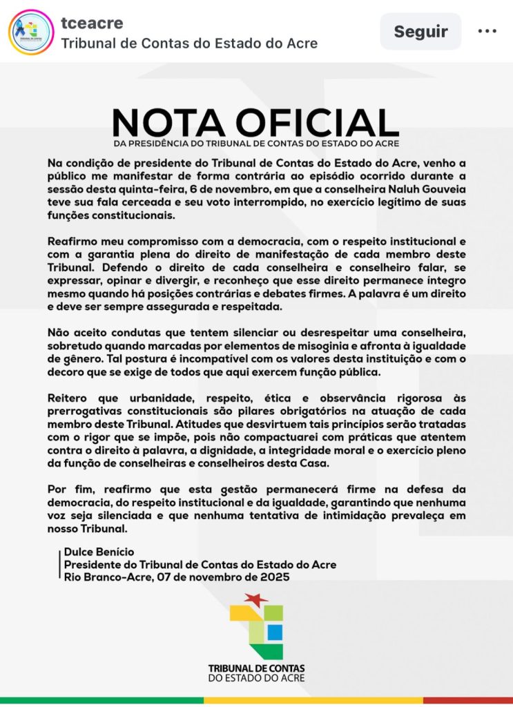 A presidente do Tribunal de Contas do Estado do Acre (TCE-AC), Dulce Benício, divulgou uma nota pública nesta sexta-feira, 7, se posicionando de forma contrária ao episódio ocorrido durante a sessão da última quinta-feira, 6, quando a conselheira Naluh Gouveia teve sua fala interrompida pelo conselheiro Cristovão Messias durante a apreciação de um processo relacionado à criação de cargos comissionados no governo estadual.