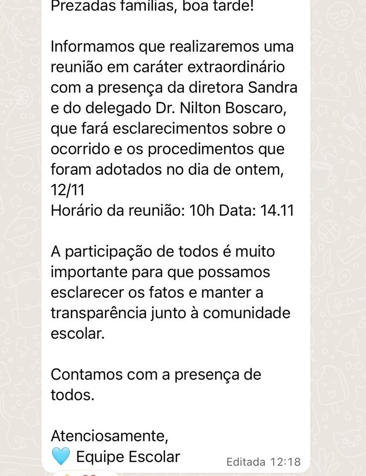 A escola convidou pais e mães dos alunos matriculados para uma reunião nesta sexta-feira, 14, que vai contar com a presença do delegado Nilton Boscaro.