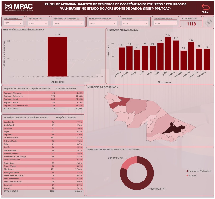 De acordo com dados do Painel de Acompanhamento de Registros de Ocorrências de Estupro e Estupro de Vulnerável, organizado pelo Ministério Público do Acre (MPAC), o estado registrou, em 2025, 1.118 casos do crime, uma média de aproximadamente 93 registros por mês.