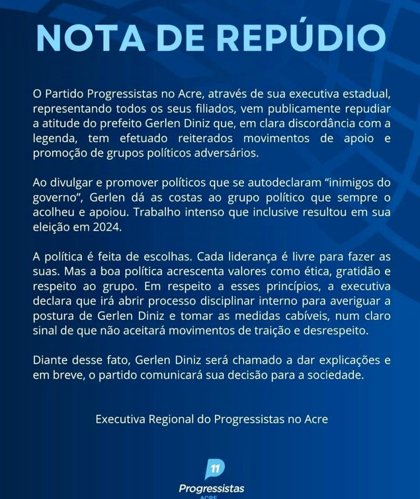 Com isso, a agenda com Alan Rick também deve mexer com o futuro partidário do prefeito de Sena Madureira. Ainda na noite desta quarta-feira, a direção do Progressistas  do Acre divulgou uma nota de repúdio onde diz que Gerlen promove e divulga “inimigos do governo”. O acusa de dá às costas ao grupo político que o acolheu e o apoiou.