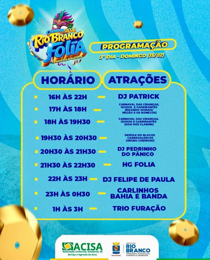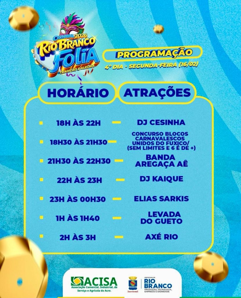 “Nós vamos ter alguma chuva, mas não teremos transbordamento do rio. E tenho certeza que esse carnaval na praça, que agora voltou a ser novamente o carnaval de Rio Branco, vai ser um espetáculo muito bom, porque é uma festa popular. A prefeitura organizou tudo, tem muita segurança, vai ser uma festa muito tranquila, inclusive para as famílias”, disse.