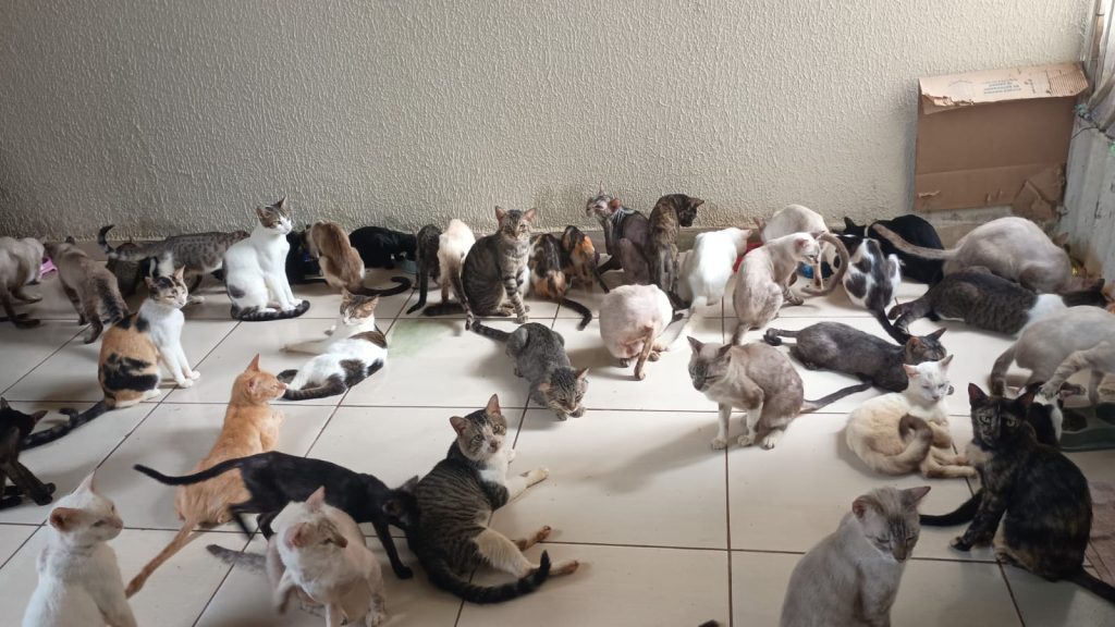 “Minha maior dificuldade hoje está sendo colocar meu aluguel em dia. Meu aluguel vence todo dia 23 e eu preciso de dinheiro para pagar. É onde eu vivo. A casa não é minha, nem é dos animais, mas é onde eu abrigo 146 gatos resgatados e cinco cachorros”, desabafa.