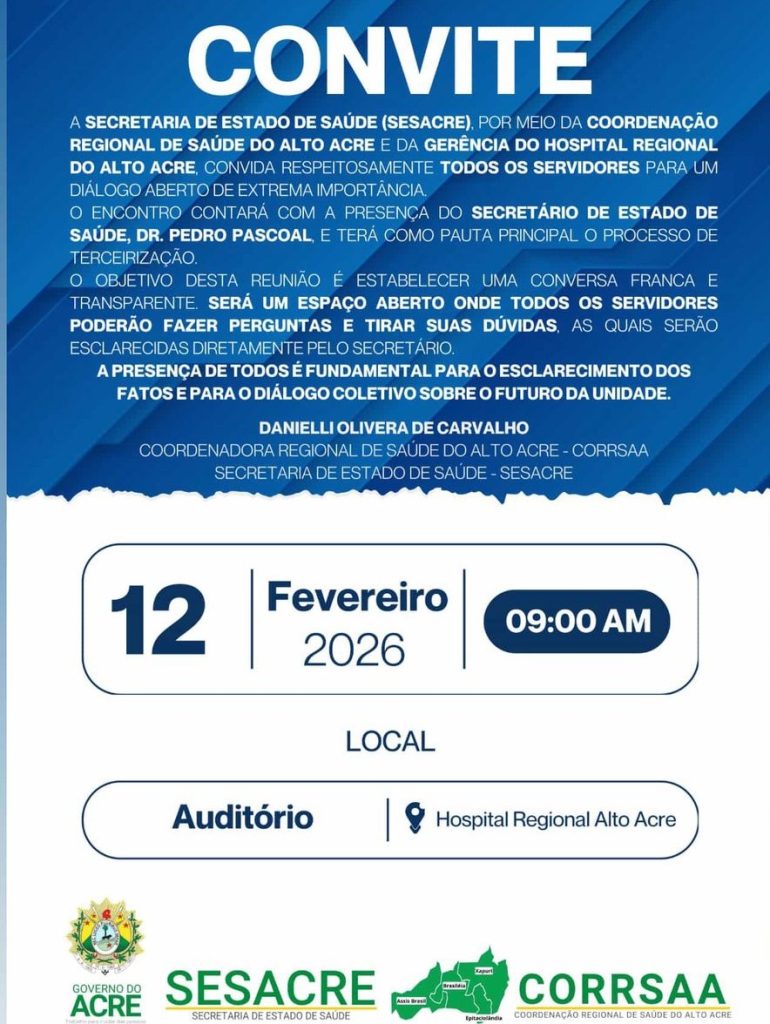 A Sesacre nega que tem interesse em privatizar o Hospital Regional do Alto Acre. Ao mesmo tempo, o secretário Pedro Pascoal fez uma reunião na quinta-feira da semana passada com os servidores para falar, justamente, sobre a terceirização da unidade de saúde. Alguém não está falando a verdade. Esse convite abaixo é falso, foi criado por IA, é uma fake news? A reunião que contou com a participação de dezenas de servidores também não aconteceu? A declaração de pessoas presentes à reunião que afirmam que o secretário de Saúde anunciou a terceirização também não é verdade? A sorte é que parece que Mailza Assis já declarou que não concorda e o assunto deve “morrer”.