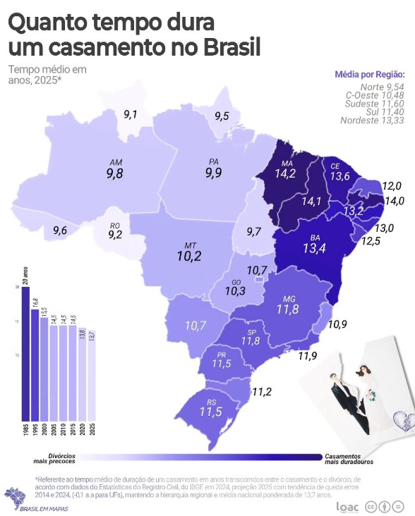A média nacional no ano passado de duração de um casamento foi 13,7 anos, mas mostra contrastes em relação as diferentes regiões do país. O Norte tem os divórcios mais precoces do Brasil com média de 9,5 anos, seguido pelo Centro-oeste (10,5) e pelo Sul (11,4), ambos abaixo da média nacional. Já no Nordeste, os casamentos são mais duradouros, com média de 13,3 anos. O Sudeste aparece em posição intermediária (11,6 anos).