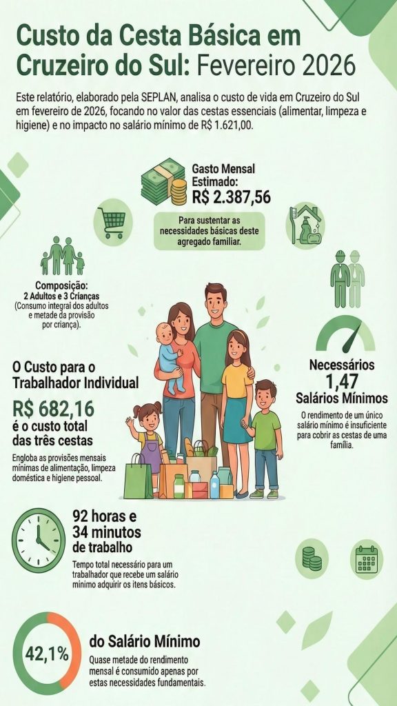 A Secretaria de Estado de Planejamento (Seplan) incluiu Cruzeiro do Sul no monitoramento mensal do custo da cesta básica. A ampliação da pesquisa representa um avanço no acompanhamento do custo de vida no Acre e permite a incorporação dos dados do Vale do Juruá nas análises econômicas do estado.