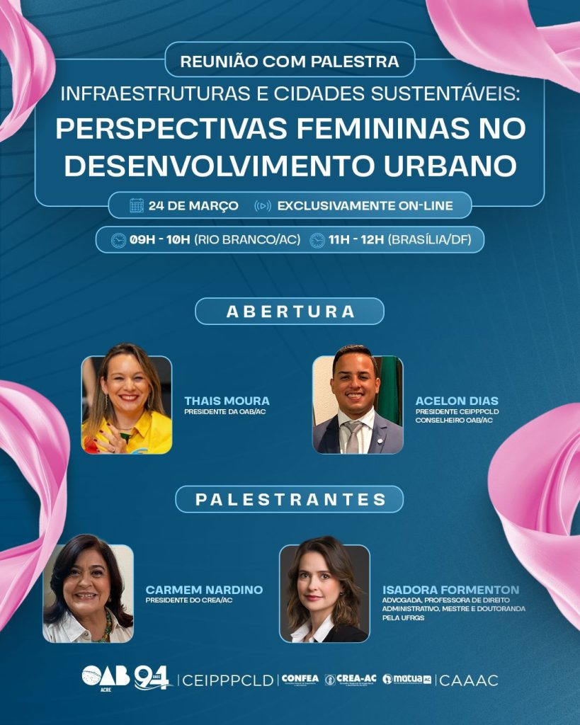 Entre as participantes confirmadas estão a presidente do CREA/AC, Carmen Nardino, que abordará o papel da engenharia no desenvolvimento sustentável das cidades, e a advogada Isadora Formenton, especialista em Direito Administrativo, que trará reflexões sobre os desafios jurídicos na governança urbana e na estruturação de projetos de infraestrutura.