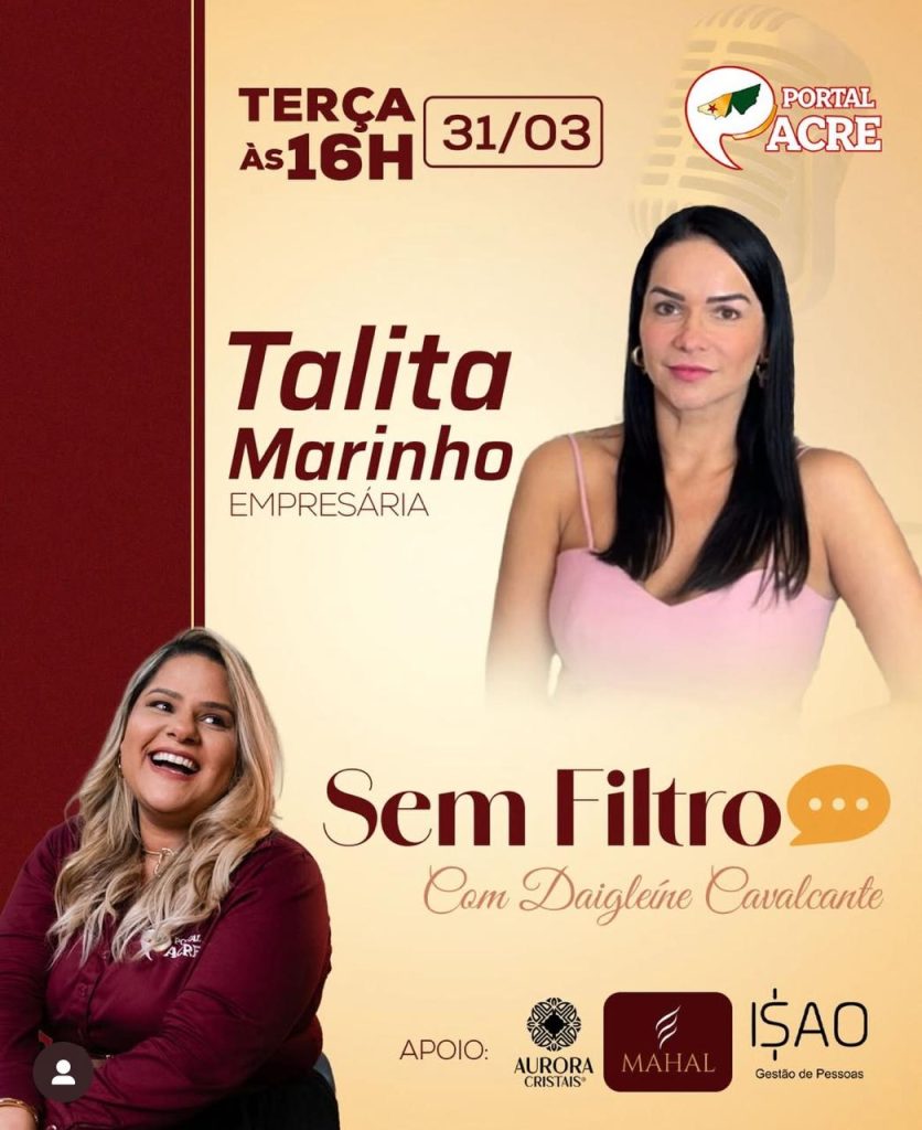 O podcast de entretenimento e empreendedorismo do Portal Acre, o Sem Filtro, vai entrevistar a empresária e decoradora Talita Marinho, será um bate papo muito interessante com a Daigleíne Cavalvante. Espero você logo mais, às 16h no canal do Portal Acre no YouTube.