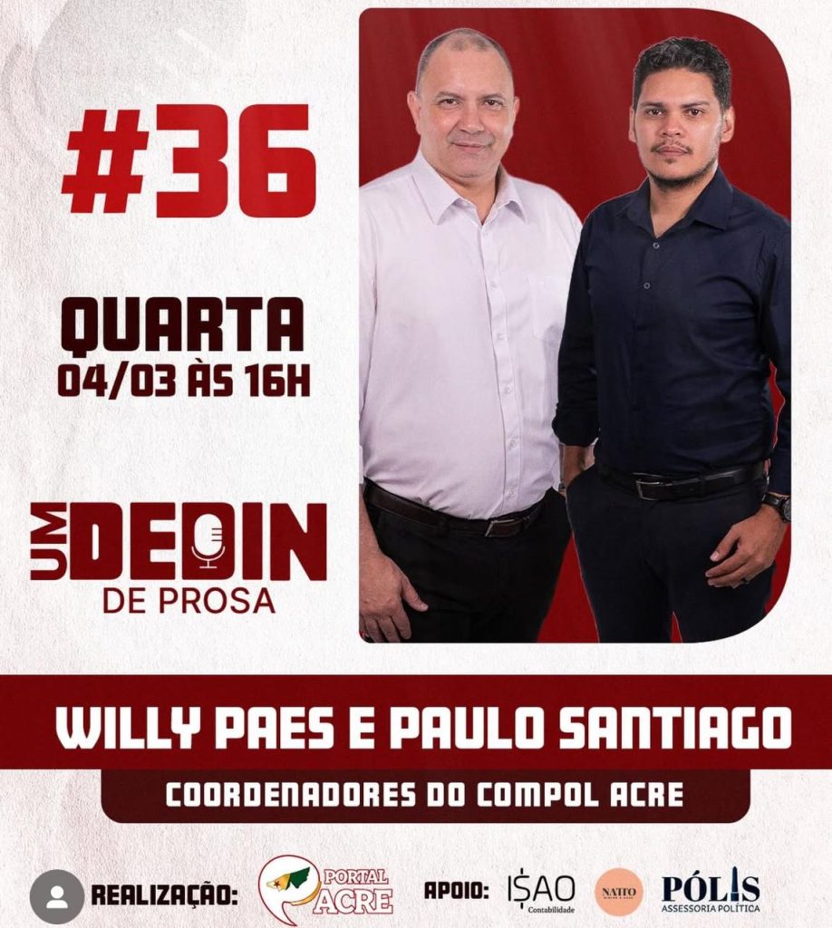 Nesta quarta-feira, 4, é dia de podcast no Portal Acre. Vamos falar ainda mais de política com as presenças de Willy Paes e Paulo Santiago, coordenadores do Compol Acre. Os caras são feras na política e, além de falar sobre o maior congresso de comunicação política e institucional, vamos falar sobre a importância da boa estratégia para vencer uma eleição. Aguardo vocês, às 16 horas, no canal do YouTube do Portal Acre.
