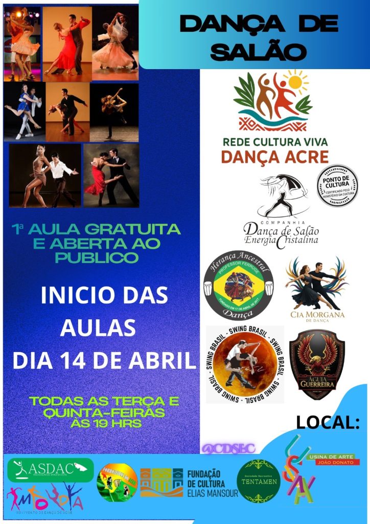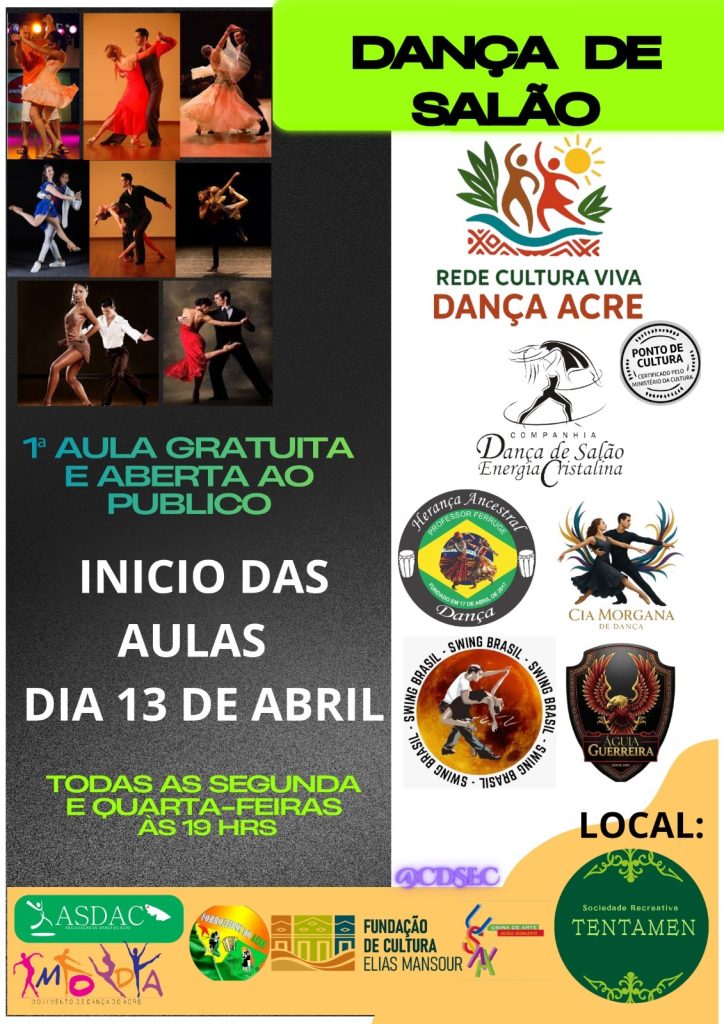 A dança de salão ganha novas opções em Rio Branco a partir dos dias 13 e 14 de abril, com aulas abertas ao público realizadas na Tentamen e na Usina de Arte João Donato, sempre às 19h. A iniciativa, coordenada pela Rede Cultura Viva Dança Acre, oferece turmas semanais com o objetivo de ampliar o acesso à cultura e promover bem-estar por meio da arte.