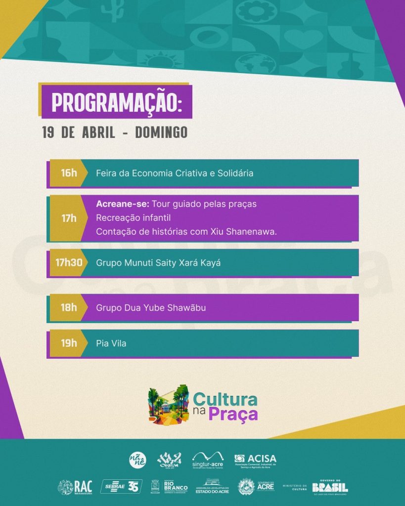 Em alusão ao Dia dos Povos Indígenas, será realizada neste domingo, 19, a 3ª edição especial do Cultura na Praça, a partir das 16h, na Praça Povos da Floresta. O evento reúne música, manifestações culturais indígenas, feira criativa e atividades para toda a família, com entrada gratuita.
