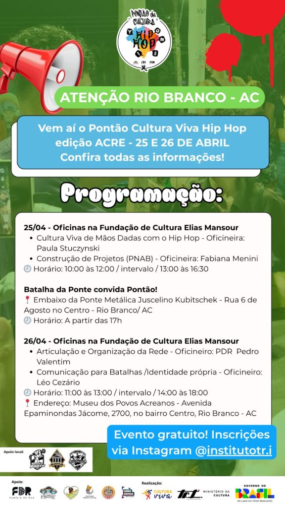 Neste próximo fim de semana, Rio Branco recebe o evento Pontão Cultura Viva Hip Hop, que acontece nos dias 25 e 26 de abril, sábado e domingo respectivamente. A programação é gratuita e reúne oficinas e batalha de rima.