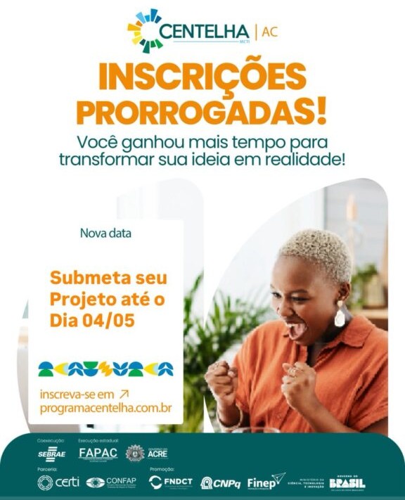 O governo do Acre, por meio da Fundação de Amparo à Pesquisa do Estado do Acre (Fapac), em parceria com a Secretaria de Estado de Indústria, Ciência e Tecnologia (Seict), anuncia a prorrogação do prazo para inscrições no programa Centelha 3, que seguem abertas até o dia 4 de maio.