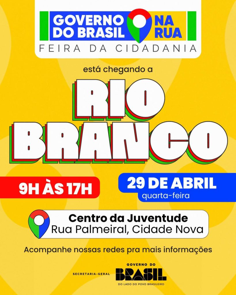 O Instituto Nacional do Seguro Social (INSS), em parceria com o Ministério da Previdência Social, participa, na próxima quarta-feira (29), da ação Governo na Rua, em Rio Branco (AC). O atendimento será realizado sem necessidade de agendamento, das 9h às 17h, no Centro da Juventude, localizado na Rua Palmeiral, no bairro Cidade Nova.