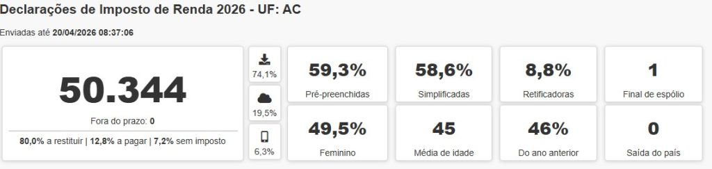 Faltando ainda mais de um mês para o fim do prazo para declaração do Imposto de Renda em 2026, os acreanos já declararam 45,70% do número em relação às declarações em 2025. No ano passado, foram entregues 110.172 declarações ao fisco federal.