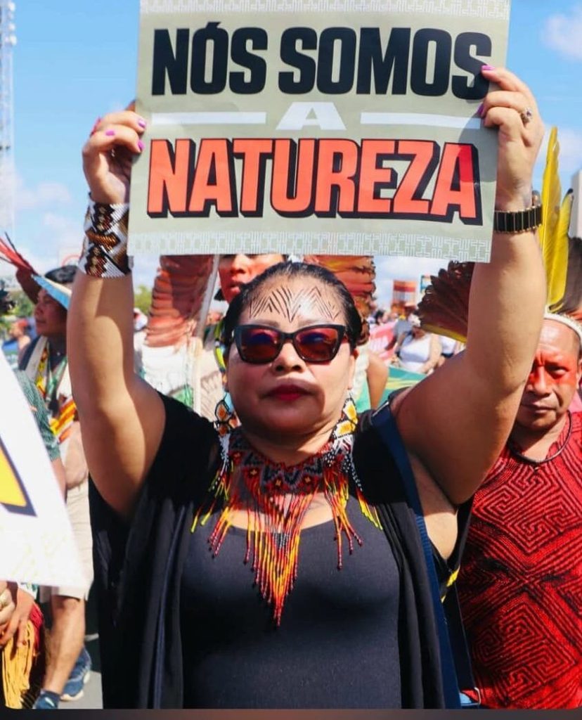 “Seja dentro da aldeia ou fora dela, estamos defendendo direitos, a participação e a escuta, para que a nossa voz seja alcançada em todos os espaços. Assim, vamos construindo um mundo melhor dentro dos territórios. Hoje, temos três frentes: aquelas mulheres que estão fortalecidas com sua autonomia lá nas pontas; mulheres que também estão dentro das associações, como caciques; e, atualmente, contamos com lideranças mulheres, pajés mulheres e professoras mulheres.