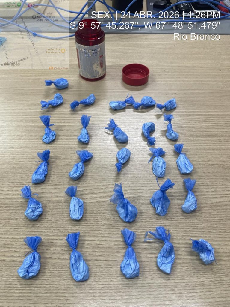 A Polícia Civil do Acre (PCAC), por meio de investigadores da Delegacia de Repressão ao Narcotráfico (Denarc), apreendeu no início da desta sexta-feira, 24, cerca de 26 trouxinhas de maconha e um invólucro de cocaína durante uma ação realizada no bairro da Paz, em Rio Branco.