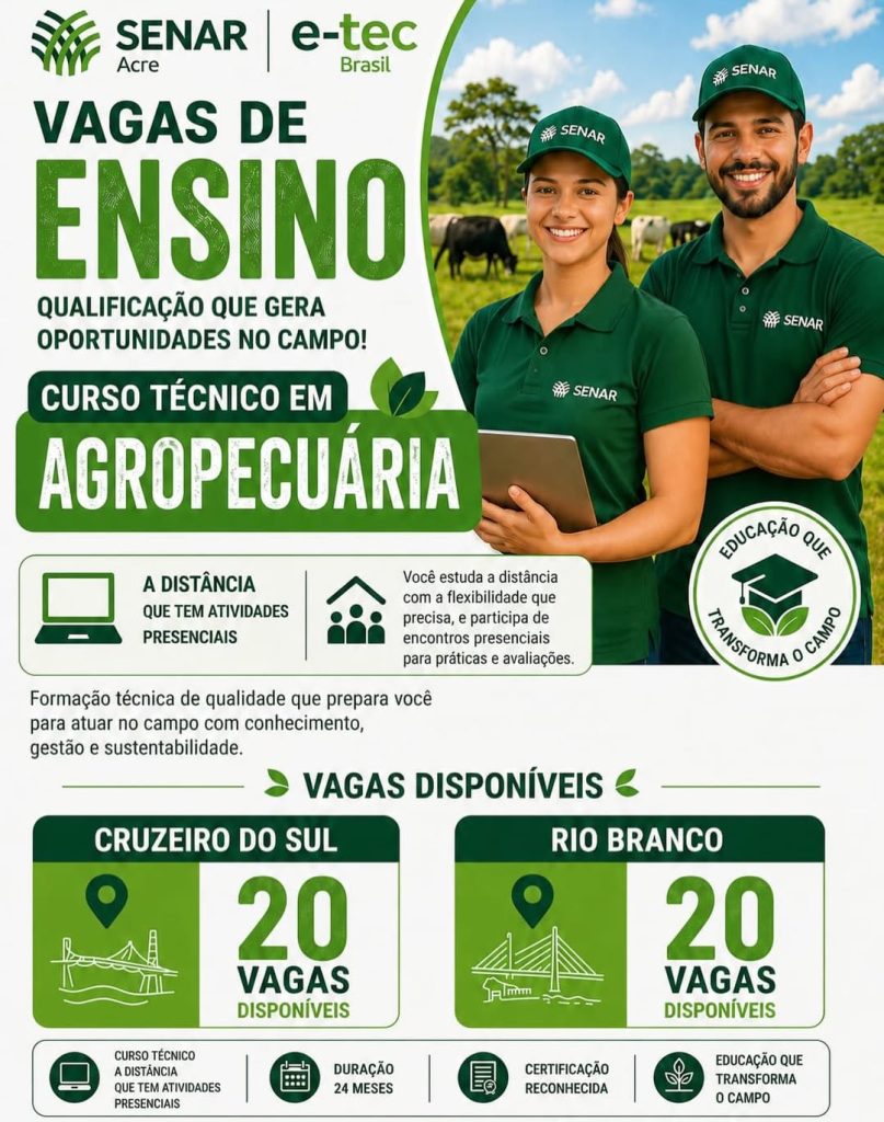 O Serviço Nacional de Aprendizagem Rural no Acre está com 40 vagas abertas para o curso técnico em Agropecuária na modalidade de ensino a distância, qualificação profissional voltada ao desenvolvimento do setor rural. A iniciativa é realizada em parceria com o e-Tec Brasil.