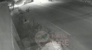 Uma câmera de segurança flagrou o momento exato em que uma motocicleta Honda Bros vermelha se chocou contra um veículo Volkswagen CrossFox na noite desta